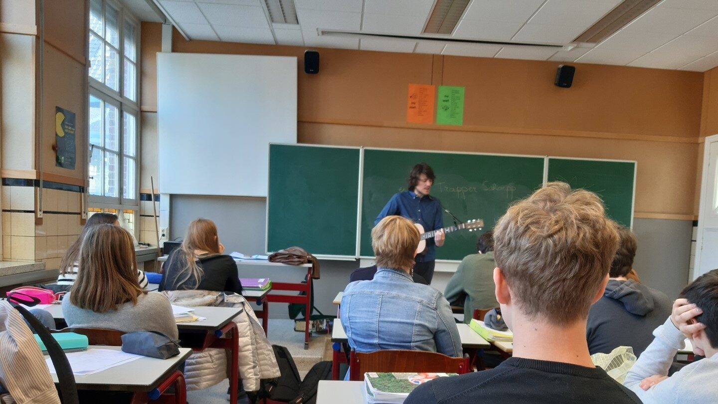 Trapper Schoepp is een 28-jarige beloftevolle Amerikaanse singer-songwriter uit Wisconsin die begin april op tournee was in ons land. Hij logeerde een paar dagen in het gezin van mevrouw Cuvelier. Op maandag 1 april kwam hij als verrassing de les Engels in het zesde jaar moderne talen opvrolijken met enkele van zijn liedjes. Schoepp is een moderne troubadour die zijn publiek via anekdotes meeneemt in zijn wereld. Zo vertelde hij over Bob Dylan, die een tijdje geleden een onuitgebrachte liedjestekst uit 1961 over Trappers home state Wisconsin liet veilen. Schoepp had daar de gevraagde 30.000 dollar niet voor in kas, maar zette ongevraagd muziek op de lyrics en paste de tekst wat aan. Via via kreeg Dylan de versie te horen en het ondenkbare gebeurde … Schoepp kreeg toestemming om het liedje On, Wisconsin uit te brengen met vermelding van zowel Dylan als Schoepp als auteurs! Het werd een blitzoptreden dat door de leerlingen erg gesmaakt werd!