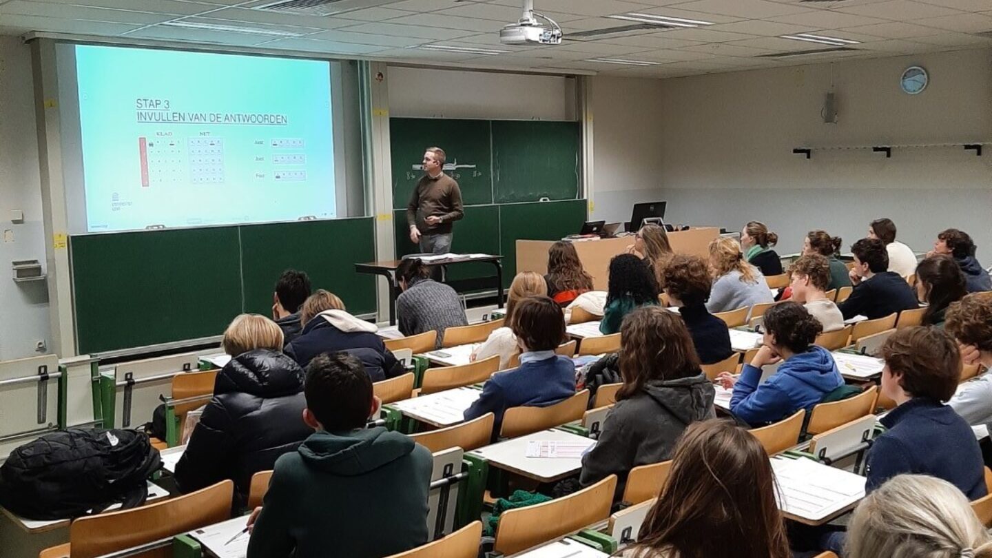 Daar aangekomen, maakten we een korte wandeling naar de Faculteit Economie en Bedrijfskunde van de UGent en konden zo het hart van de studentenstad bezichtigen in de vroege uurtjes. Op de Campus Tweekerken volgden we een workshop over multiplechoicevragen. Het verschil tussen giscorrectie en de ‘hogere cesuur’ – het evaluatiesysteem waarmee men in Gent werkt – werd grondig besproken aan de hand van een proefexamen dat we ter plekke aflegden. Eerst waren er 10 vragen om je algemene kennis te toetsen, daarna 5 vragen met betrekking tot tekstanalyse en ten slotte 5 vragen die gingen over een economische tekst die we in de klas reeds doornamen. De vragen werden op een interactieve manier nabesproken en tussen iedere vragenreeks was er een woordje uitleg.